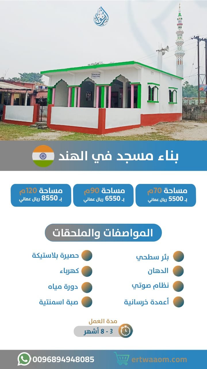 في شركة ارتواء ننفذ لك مشروع بناء مسجد في الهند بالاسم الذي تختاره مع كامل الاهتمام بالتفاصيل الدقيقة والتنفيذ الاحترافي لضمان راحة المصلين، مصمم بطابع معماري يناسب البيئة المستهدفة.