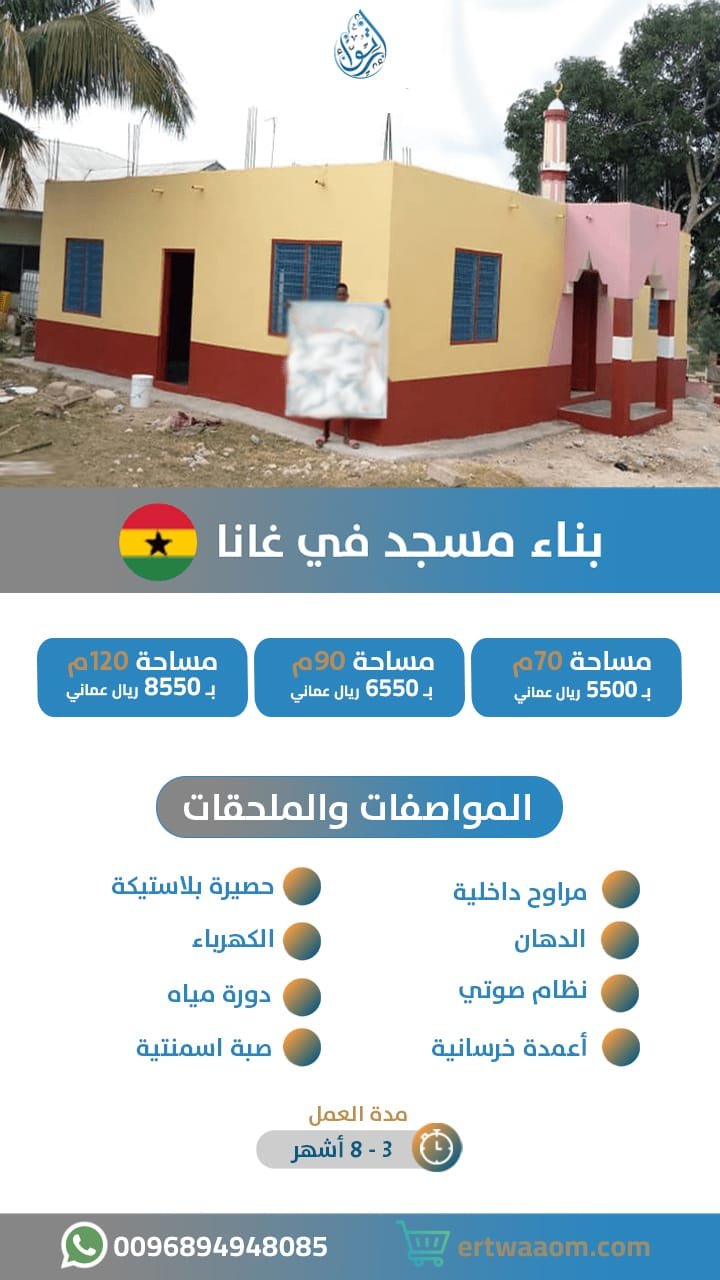 في شركة ارتواء ننفذ لك مشروع بناء مسجد في غانا بالاسم الذي تختاره مع كامل الاهتمام بالتفاصيل الدقيقة والتنفيذ الاحترافي لضمان راحة المصلين، مصمم بطابع معماري يناسب البيئة المستهدفة.